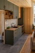 Die Küchenzeile ist offen in den Wohnbereich integriert, bleibt dabei aber klar strukturiert und funktional getrennt.